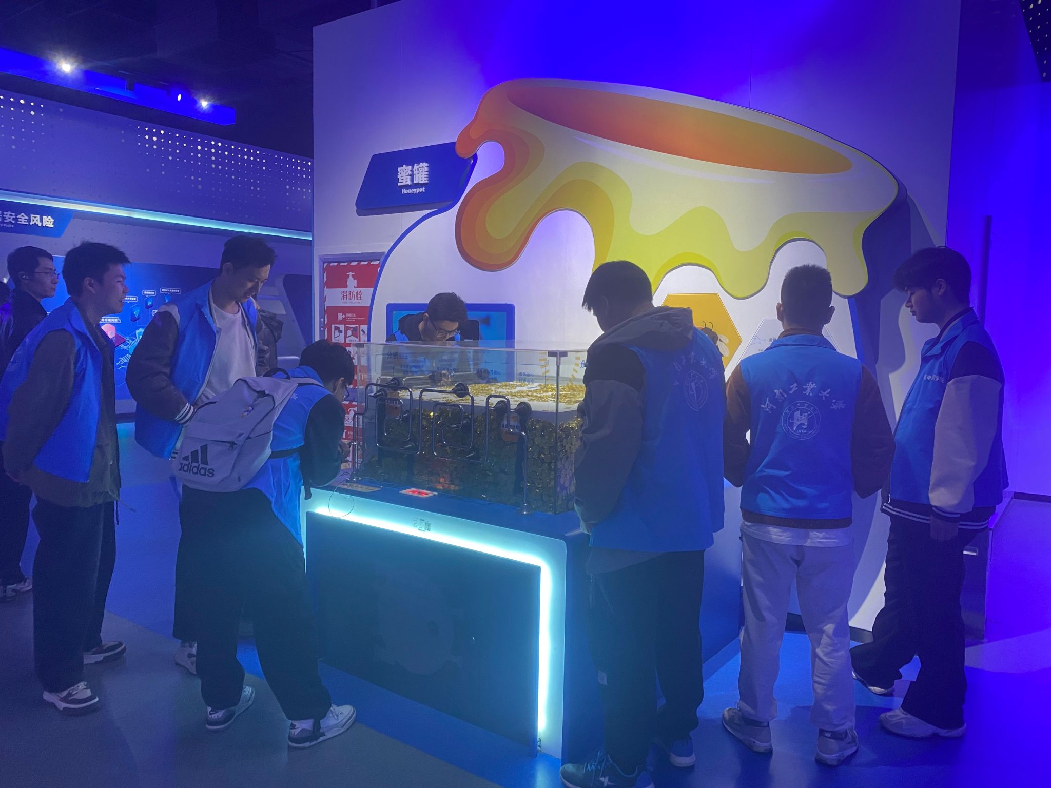 郑州市网络安全科技馆设置个人安全、政企安全、社会安全、综合竞技四个主展区,共200余个展项和1700多件展品。在讲解员的带领下,同学们通过听讲解、互动体验、实物演示等方式,了解了恶意手机充电桩、NFC隐私泄露、网络新型诈骗、智能家居安全隐患等生活中常见的网络安全问题,深入了解网络密码与安全、网络攻击和防御、网络浏览器的技术与发展等网络知识,学到了常用的网络安全技术和抵御安全风险技巧。