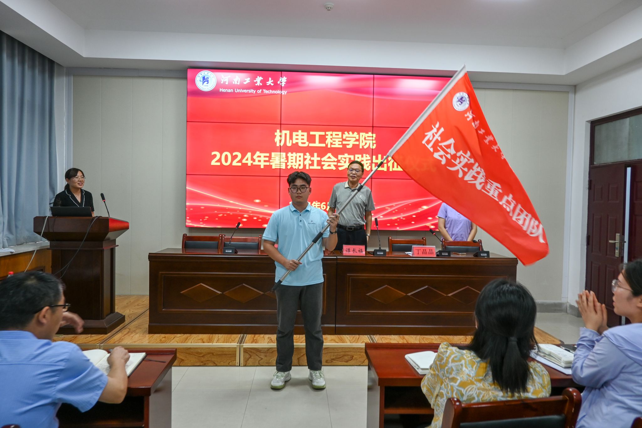 在捷赛厅举行2024年暑期社会实践出征仪式。院党委书记谭长福、副书记张小彩、全体辅导员老师及2024年暑期社会实践全体队员参加了此次会议。会议由院团委副书记丁晶晶主持。