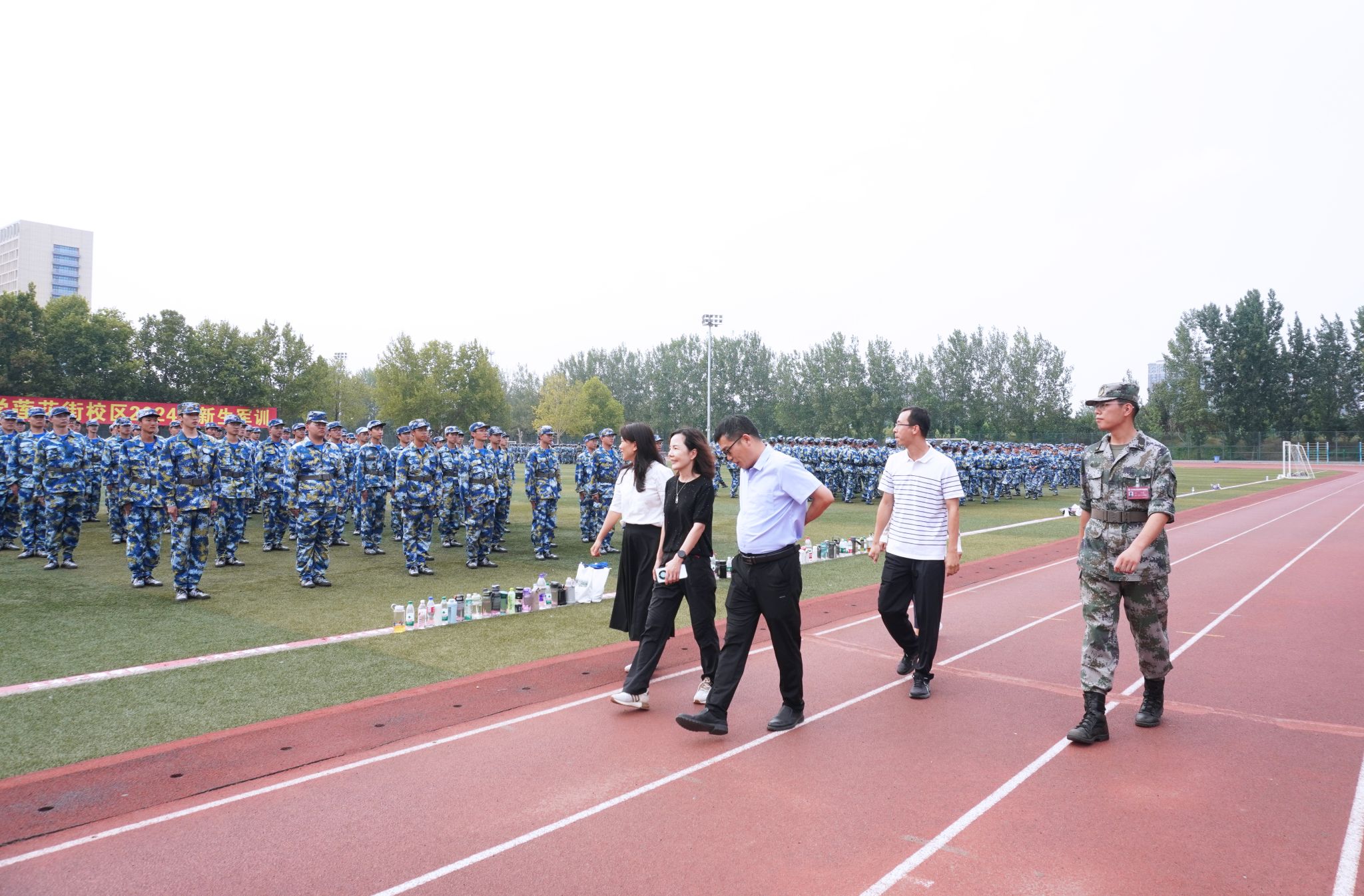 党委书记魏涛、院长吴兰、党委副书记张东霞、学工办主任刘伟杰及新生辅导员一行来到东操场军训场地,看望慰问军训教官及全体2024级新生,深入了解2024级新生军训情况。并向坚守岗位的教官和辅导员致以节日的问候和诚挚的感谢。
