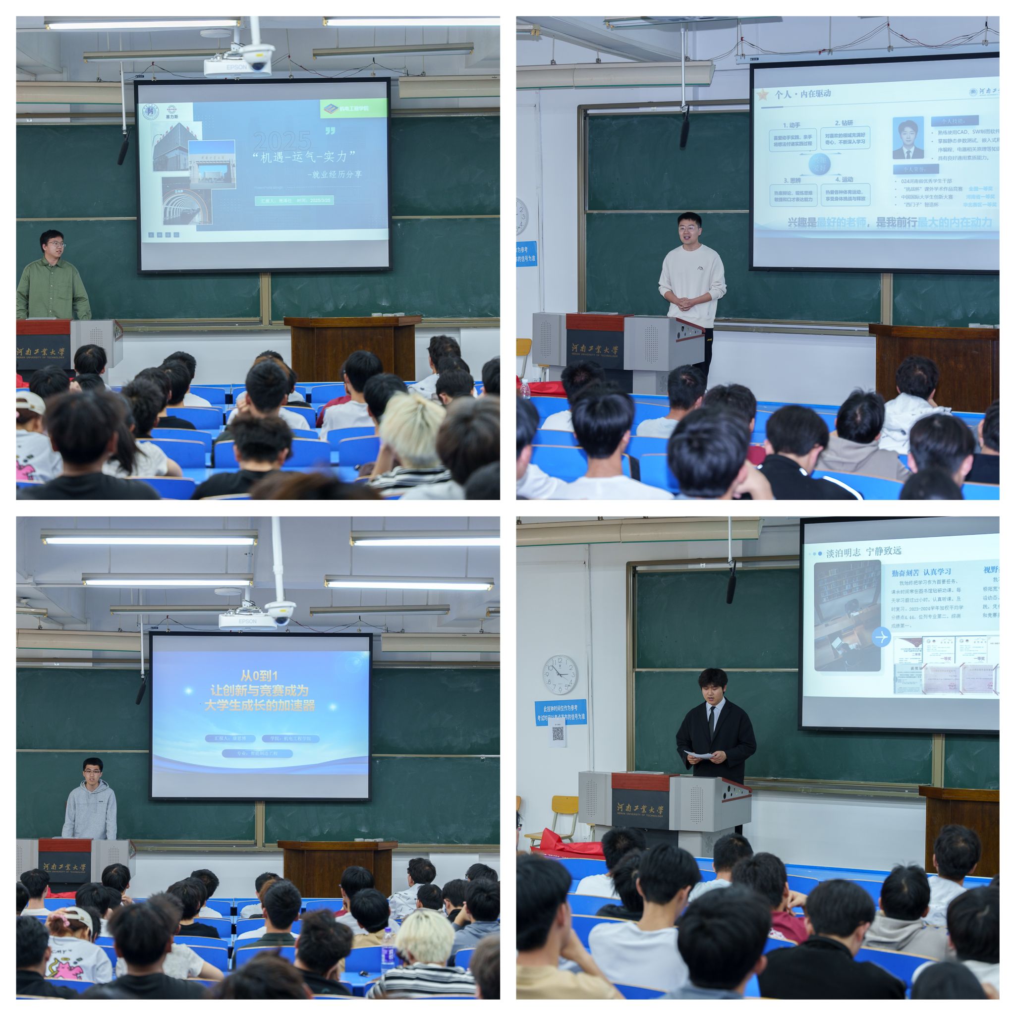 在分享环节,周泽阳结合在第二届“全国大学生职业规划大赛”获得河南省金奖的比赛经历,为同学们系统讲解了职业发展底层逻辑,鼓励同学们要学好专业知识,打牢基础,抓住机遇,提早做好职业生涯规划。