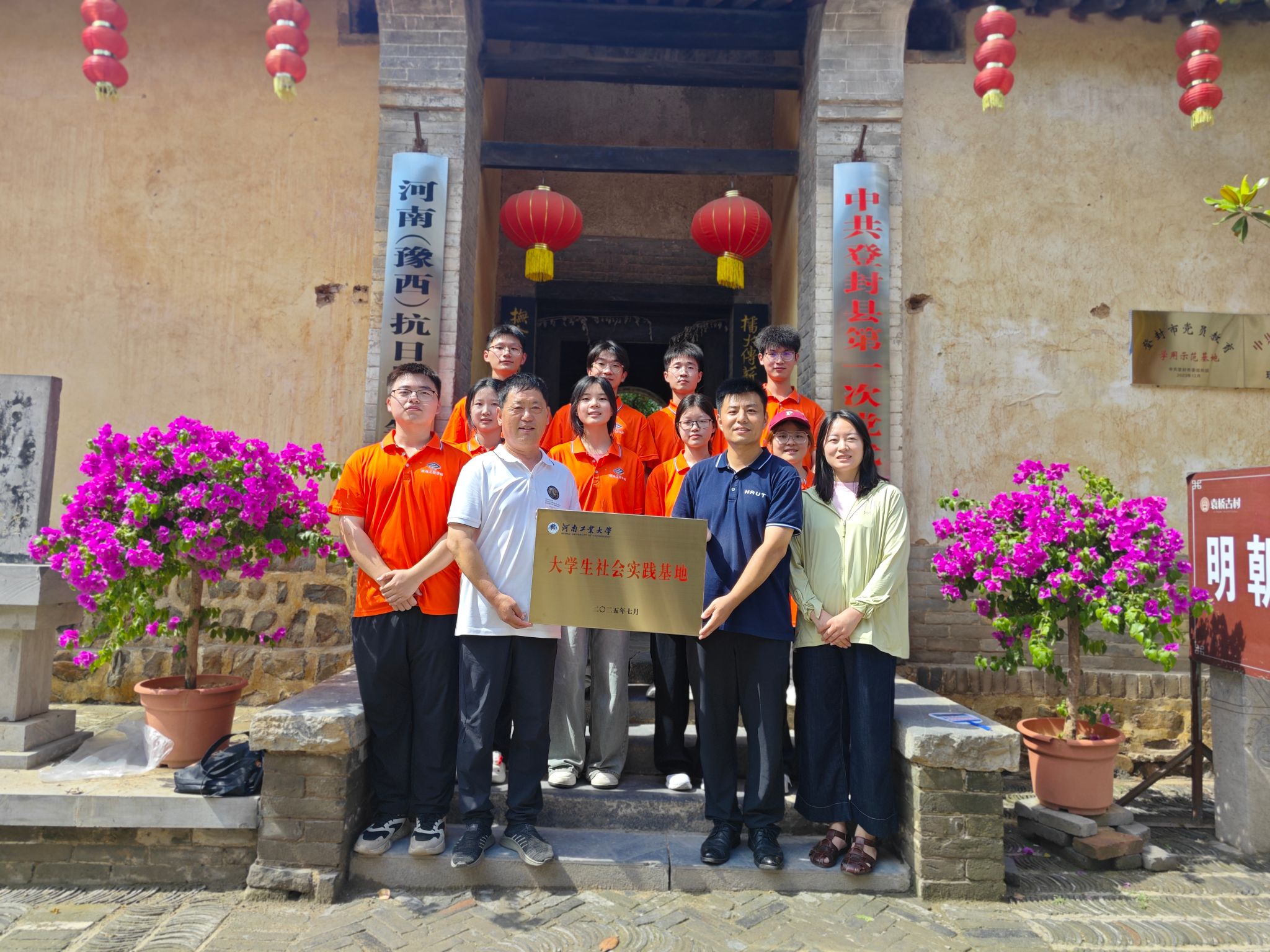 与登封市袁桥古村共建大学生暑期社会实践基地授牌仪式在袁桥古村举行。辅导员周贝贝、靳晓燕、“烽火袁桥·红色薪传实践行”团队队员及袁桥古村研学总经理司建彬参加授牌仪式。