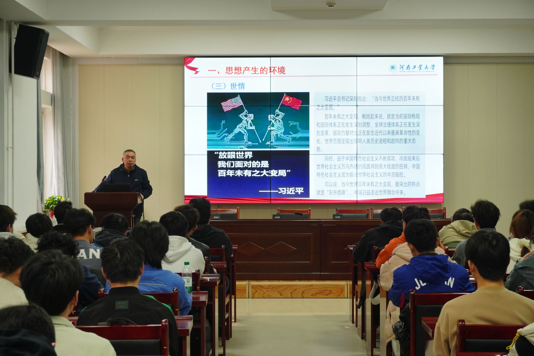 仪式结束后,校党委巡察(督查)办公室主任孟凡鑫以《习近平新时代中国特色社会主义思想》为题,为全体学员讲授党课第一讲。 (撰稿/丁晶晶 摄影/陈逸涵、郑雨哲)
