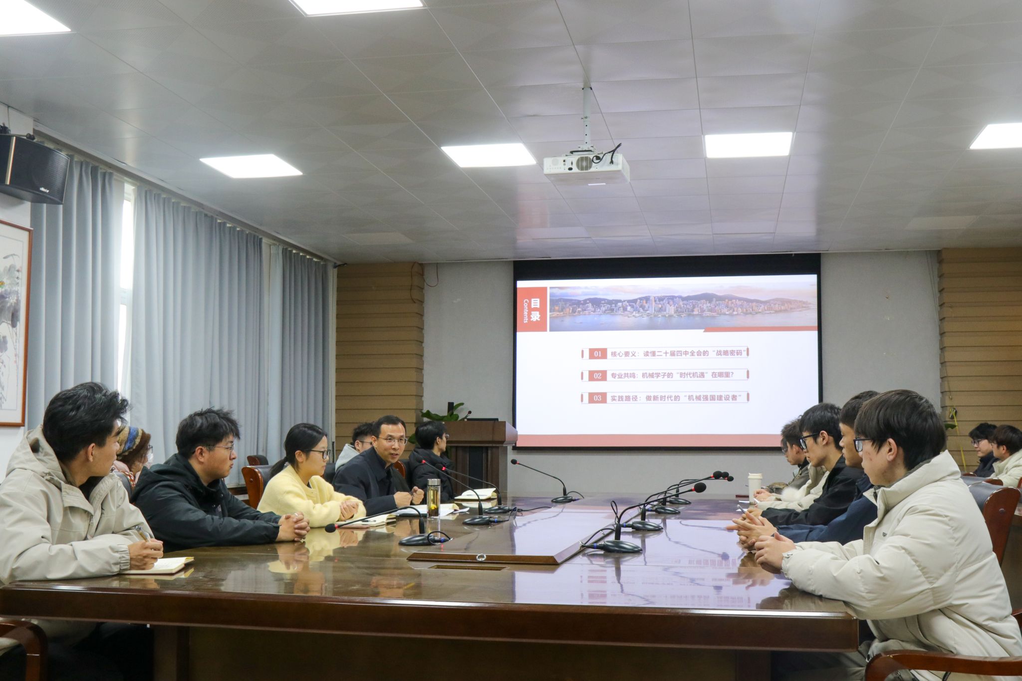 宣讲会上,魏涛以《深悟党的二十届四中全会精神实质 勇担“十五五”奋进新使命》为题,围绕“全会讲了什么”“和我们有什么关系”“我们该怎么做”三个维度展开宣讲。他将国家发展的宏伟蓝图与机械学科的优势特色紧密结合,聚焦“高质量发展”“科技自立自强”“制造强国”三个关键词,引导学生深入理解全会的战略部署;同时,从高端装备制造、智能化转型、绿色化发展等方向出发,启发同学们思考机械学子在新时代面临的机遇与责任。