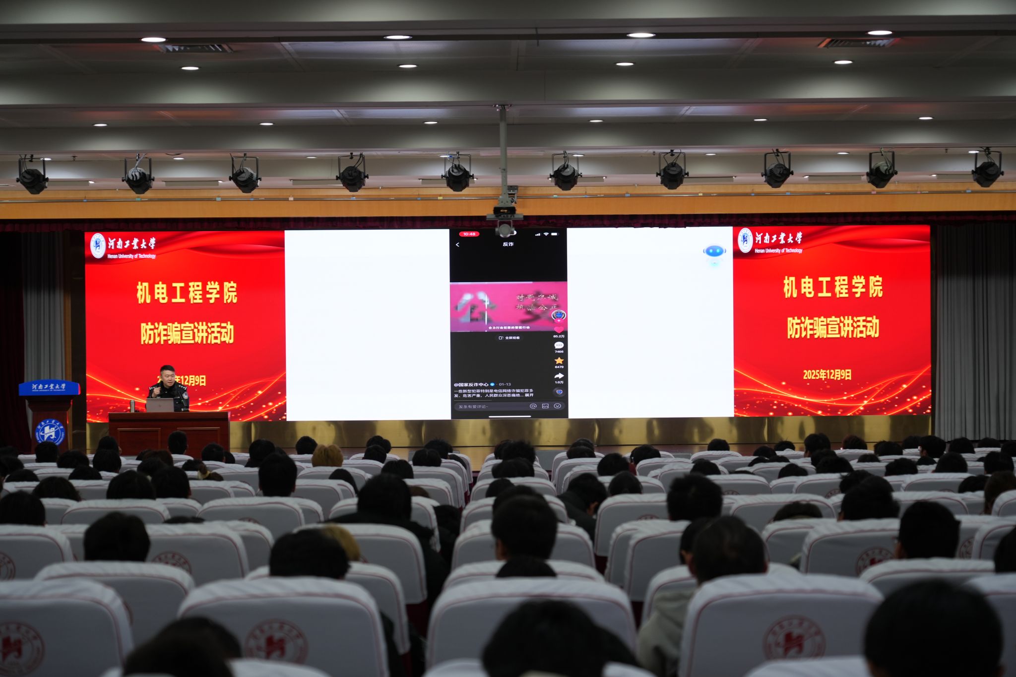 邀请市公安局高新分局反诈大队民警吴昊走进校园,开展反诈宣传专题活动。活动由保卫处副处长李磊主持,学院党委副书记张东霞、辅导员杨贞贞、谢亚杰及近500名学生代表到场参与。