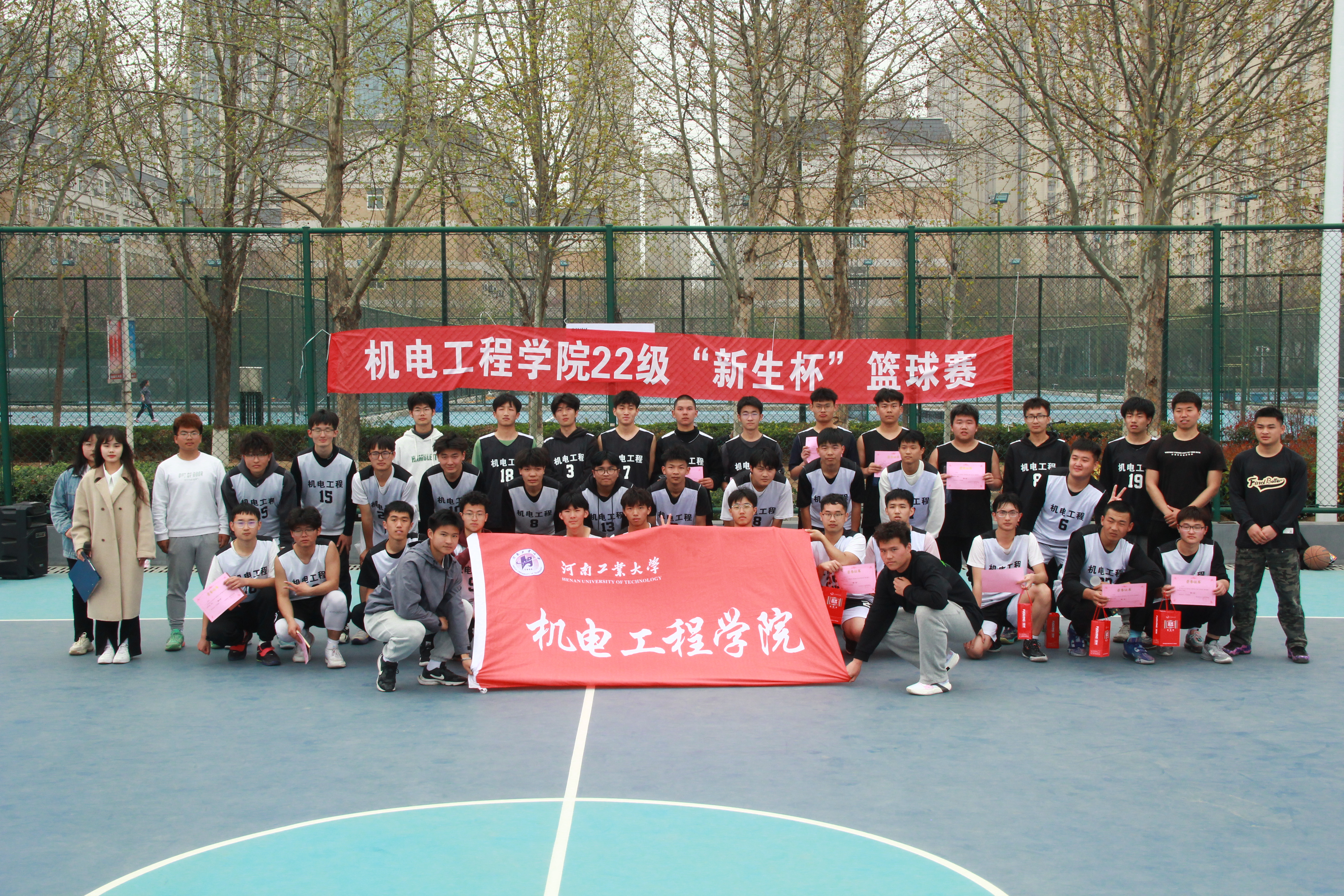经过小组循环赛、排位赛的激烈角逐,机械2201、2102代表队最终以38:35的三分优势赢得此次篮球赛冠军。智造2205、2206代表队获得亚军,智造2203、2204代表队获得季军。辅导员老师为获胜团队颁发了奖杯并与全体队员合影留念。