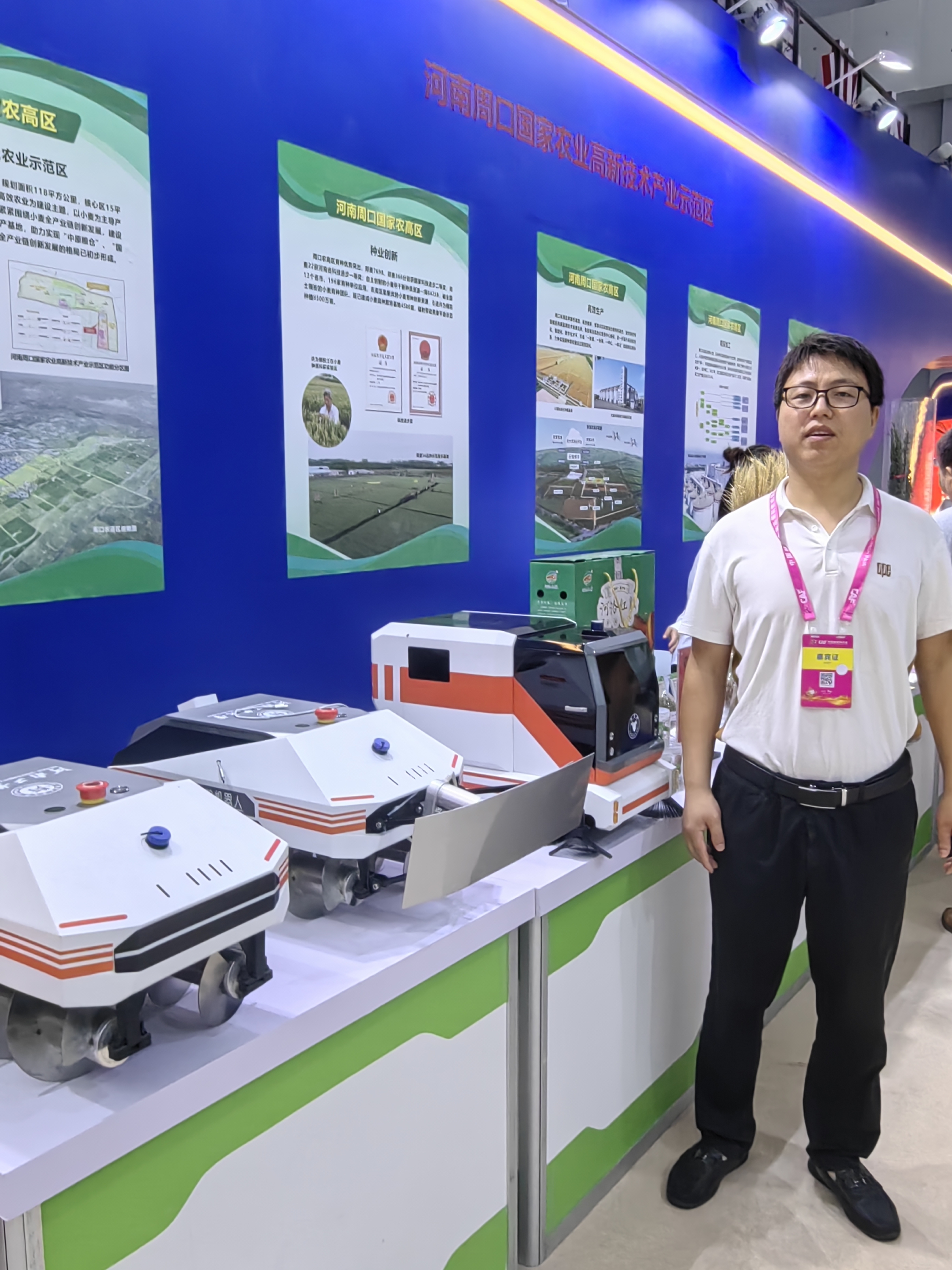“双一流”团队受邀参加农业高新技术成果展。粮油工程及设备系系主任王明旭、车辆工程系副主任孙朋带队展示了团队研发的平粮机器人、翻粮机器人、智能粮食清扫车、粮食加工在线粒度测试仪等科研成果。