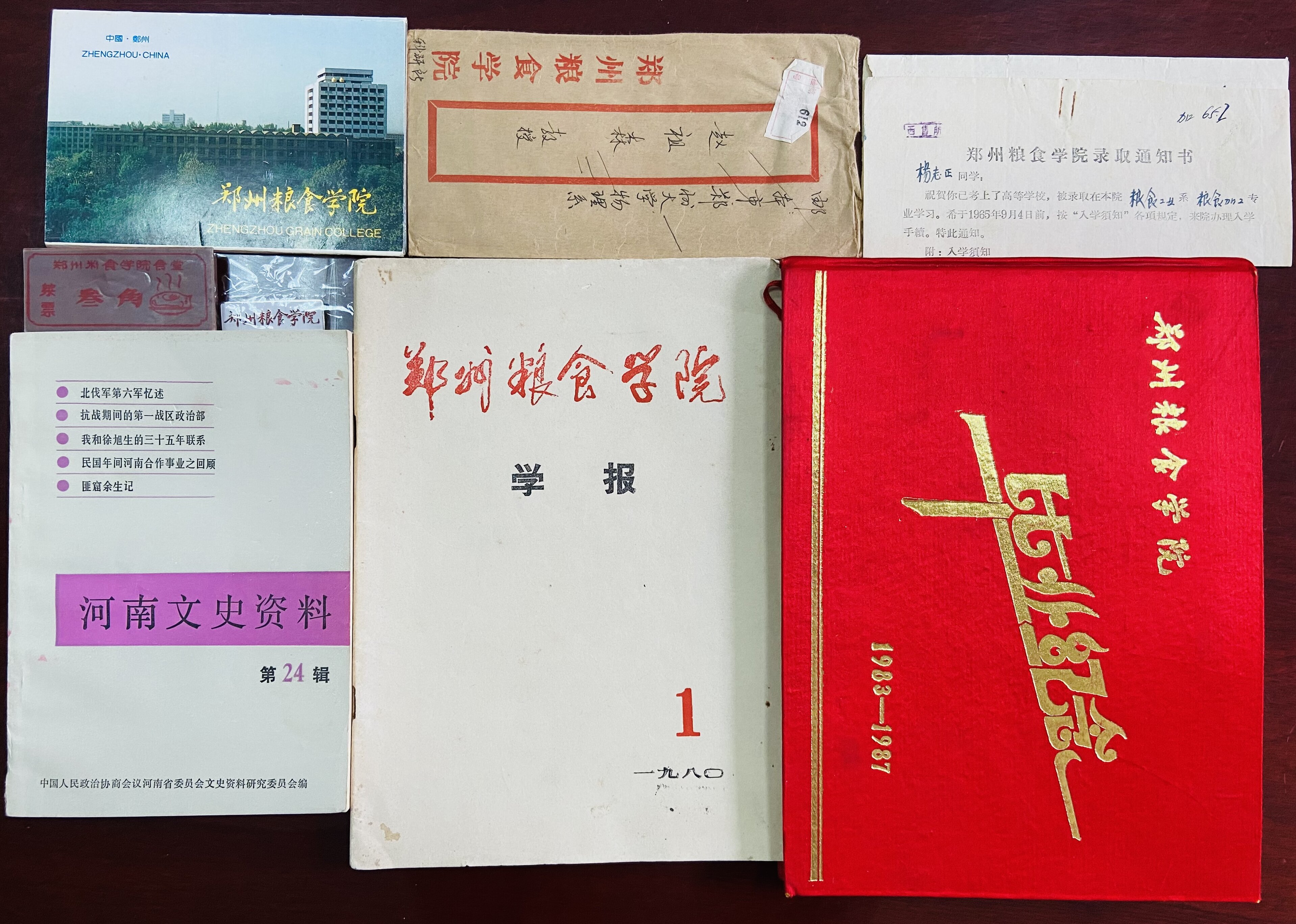 孔路辉校友此次捐赠的校史史料实物包括:《郑州粮食学院学报》创刊号1本、1965级录取通知书1份、学校食堂饭票若干、1983级毕业册1本、《河南文史资料》1本、明信片1套、1983年信封1份等共计7件历史资料。他表示,希望这些历史资料能充分发挥其所负载的文化价值,为学校校史研究和建设添砖加瓦。