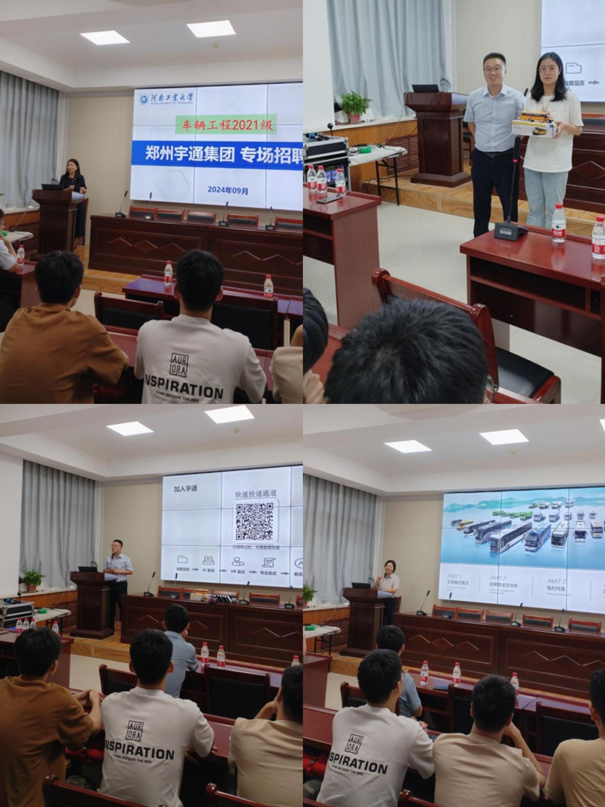 车辆工程专业2025届应届毕业生宇通专场招聘会在7224报告厅顺利举行。宇通集团国内业务链生产人力资源管理科赵洪梅科长、宇通客车国内业务链制件车间申彬主任、宇通客车国内业务链工会主席闫鸿磊等5人参加招聘会。出席会议的还有低调看直播