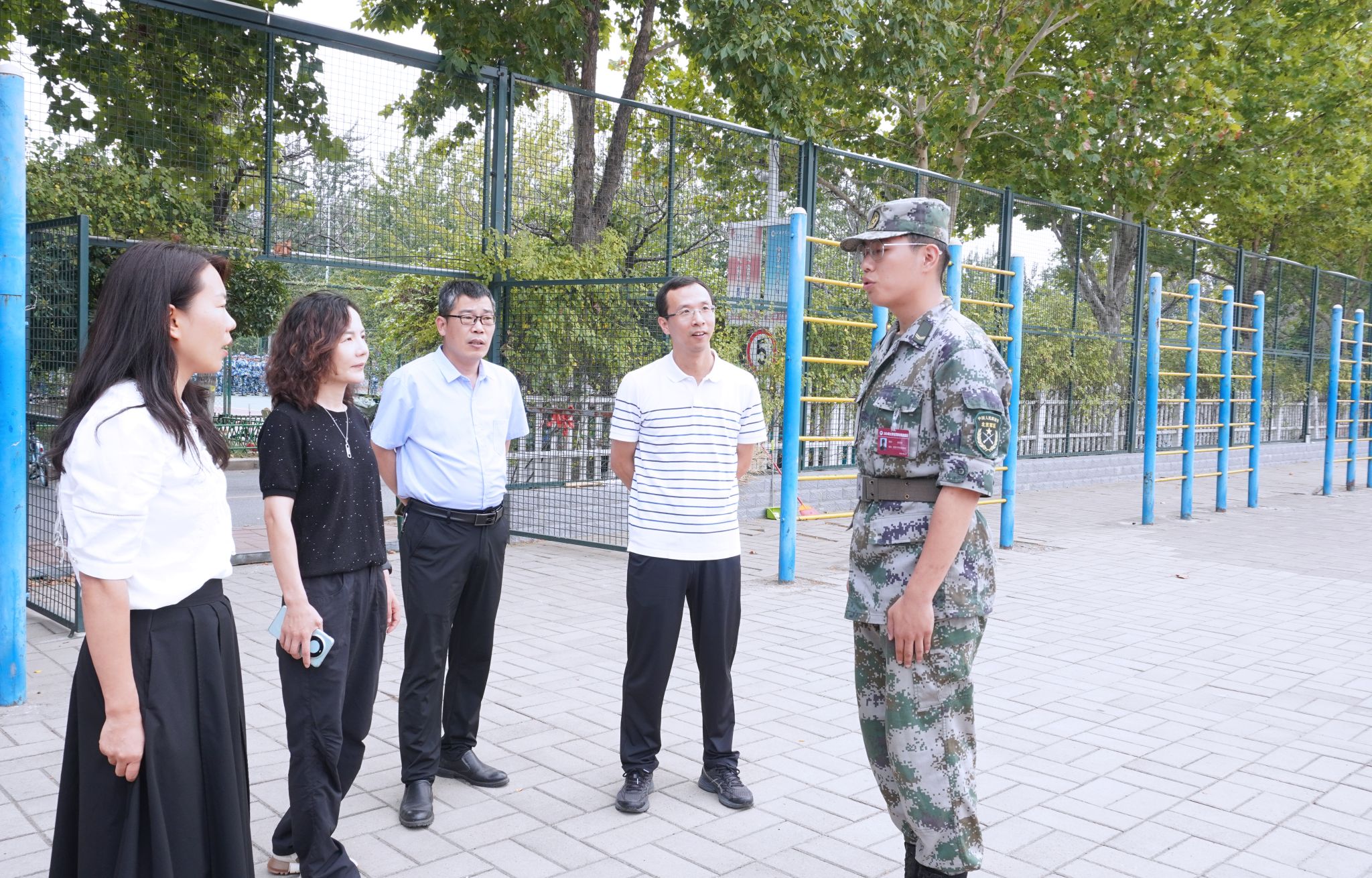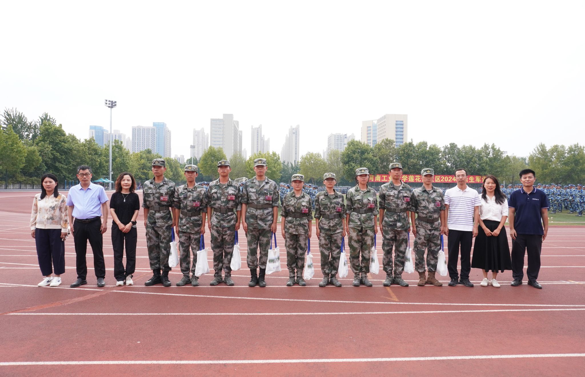 党委书记魏涛、院长吴兰、党委副书记张东霞、学工办主任刘伟杰及新生辅导员一行来到东操场军训场地,看望慰问军训教官及全体2024级新生,深入了解2024级新生军训情况。并向坚守岗位的教官和辅导员致以节日的问候和诚挚的感谢。