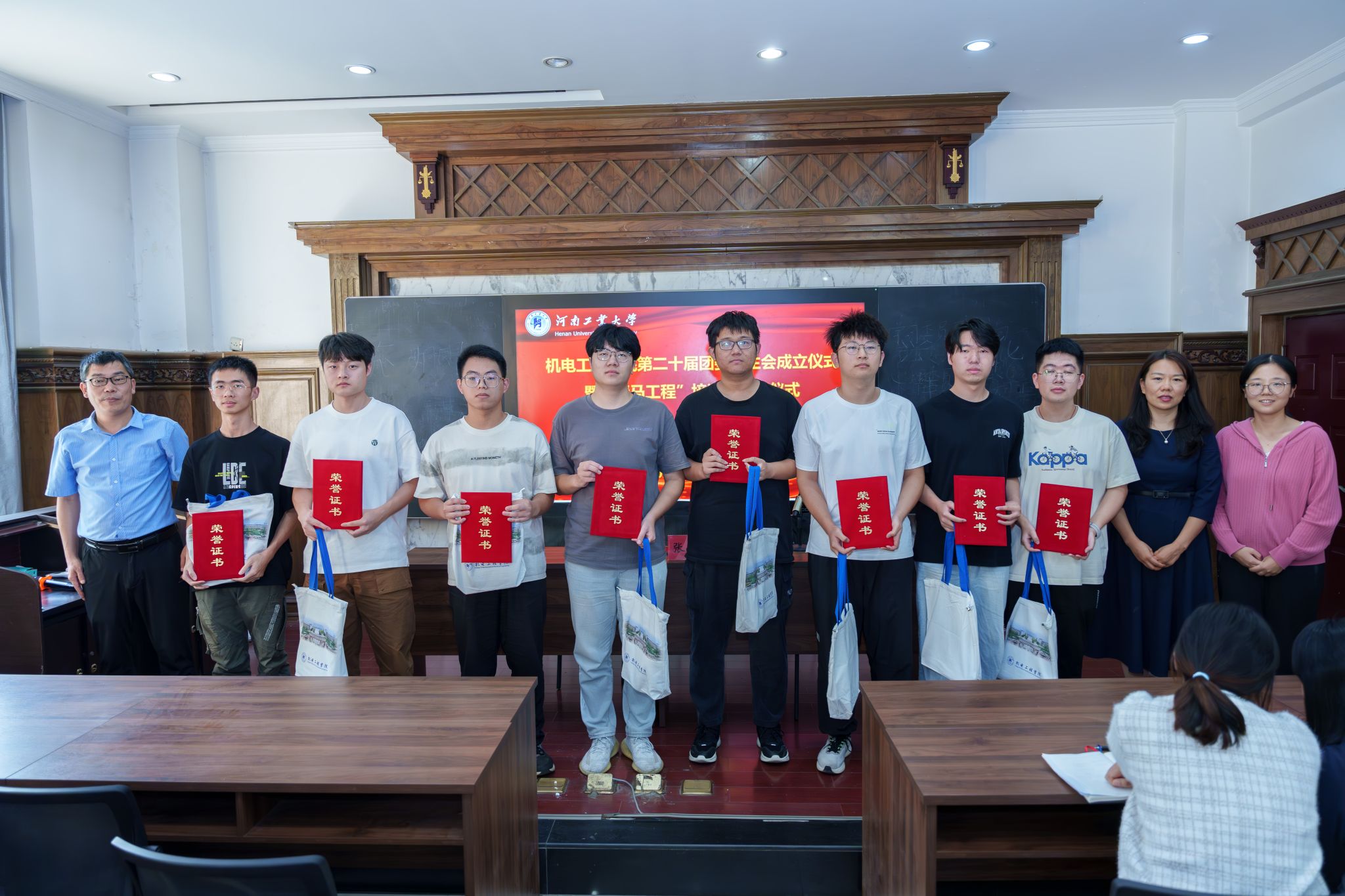 丁晶晶宣读了第十九届团委学生会表彰名单及第二十届团委学生会聘任名单。全体辅导员老师为受表彰同学颁发荣誉证书、纪念品并合影留念。