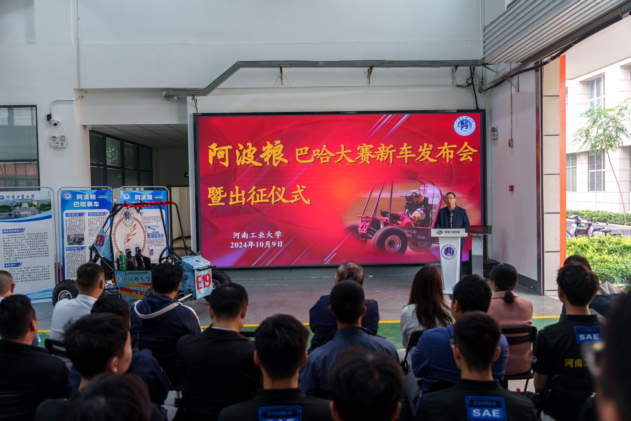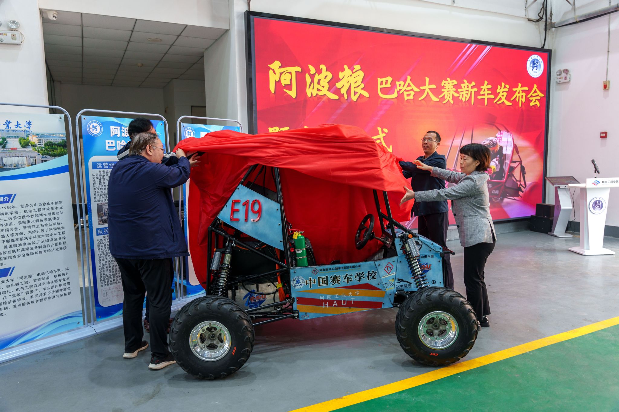 芦宁军、马雁、魏涛、朱红瑜为新车揭幕并授队旗。车队学生驾车全方位展示了车辆的稳定性、通过性等专业性能。