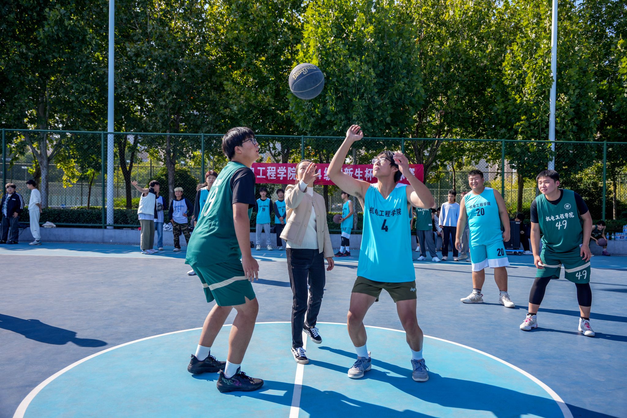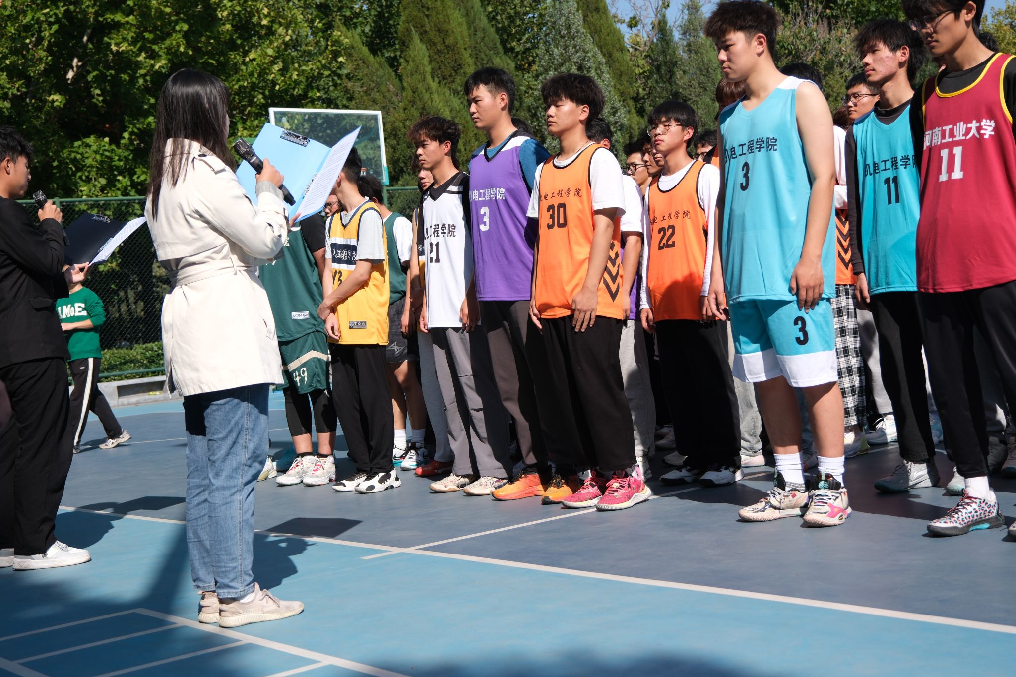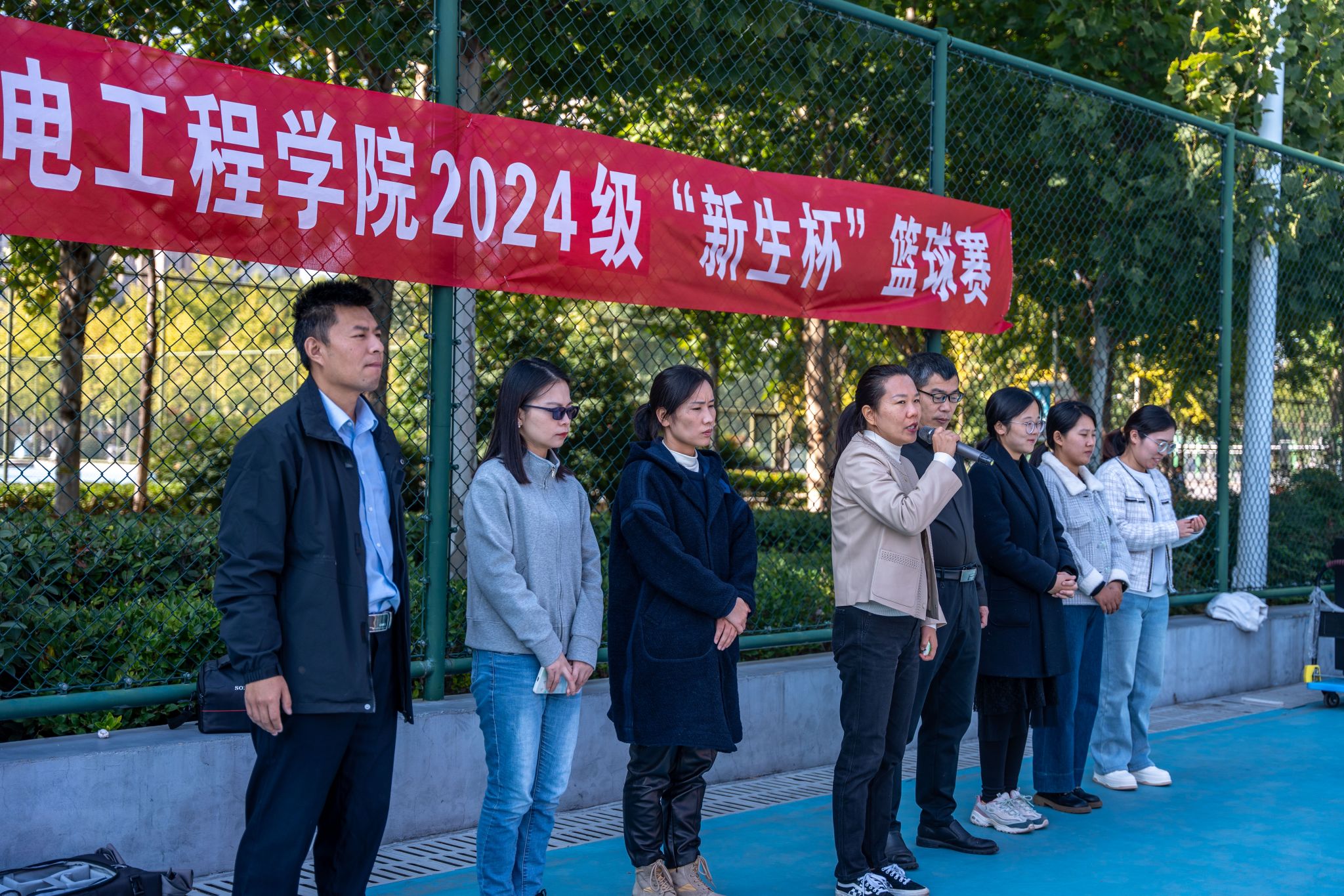2024级“新生杯”篮球赛在莲花街校区西篮球场拉开帷幕。学院党委副书记张东霞、学工办主任刘伟杰、团委副书记丁晶晶、全体辅导员、裁判员、运动员和工作人员参加了开幕式。