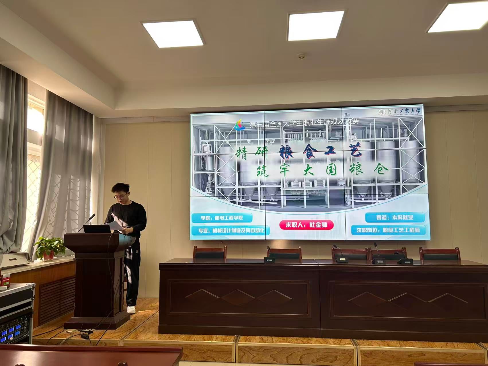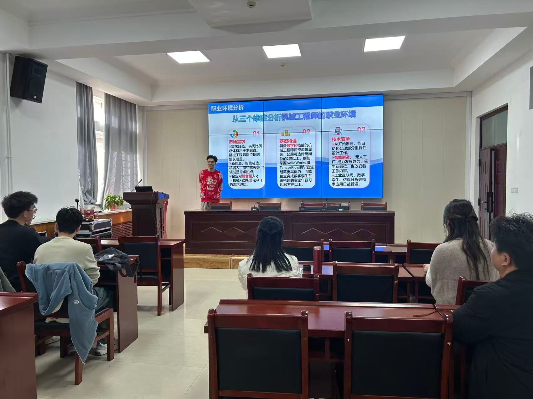 比赛分为“职业生涯规划书评审”和“现场展示与答辩”两个环节。在现场展示环节,选手们结合PPT,从容自信、条理清晰地向评委和观众阐述了自己的职业梦想与规划路径。同学们的规划方向多元且聚焦专业特色,涵盖了智能装备设计与研发、高端制造与工艺优化、工业机器人系统集成、新能源汽车技术、智能制造系统架构师等前沿领域。