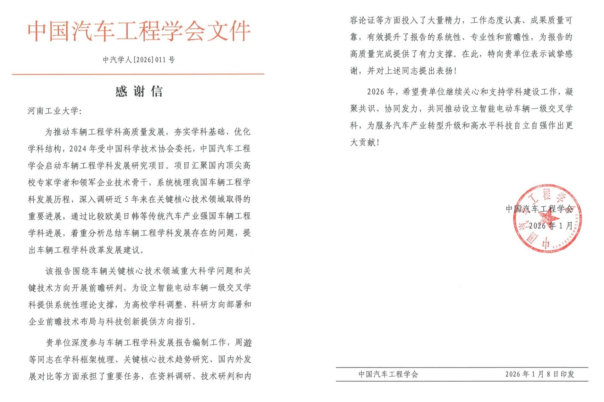 近日,中国汽车工程学会向我校发来感谢信,信中对低调看球