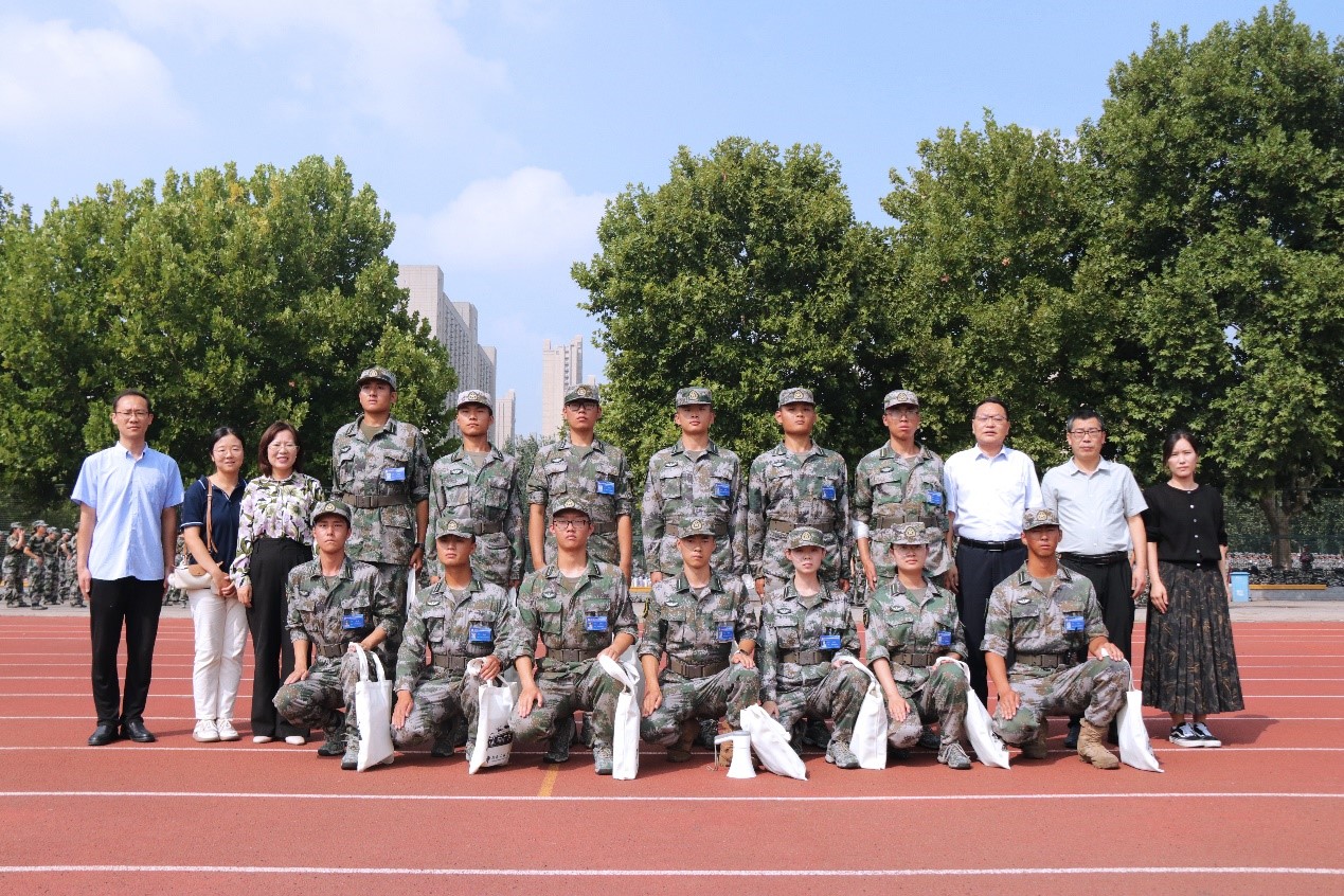 学院领导老师来到队列方阵前,与教官们进行亲切交流,详细询问军训工作情况,对教官的辛苦付出表示感谢并送上学院慰问品。