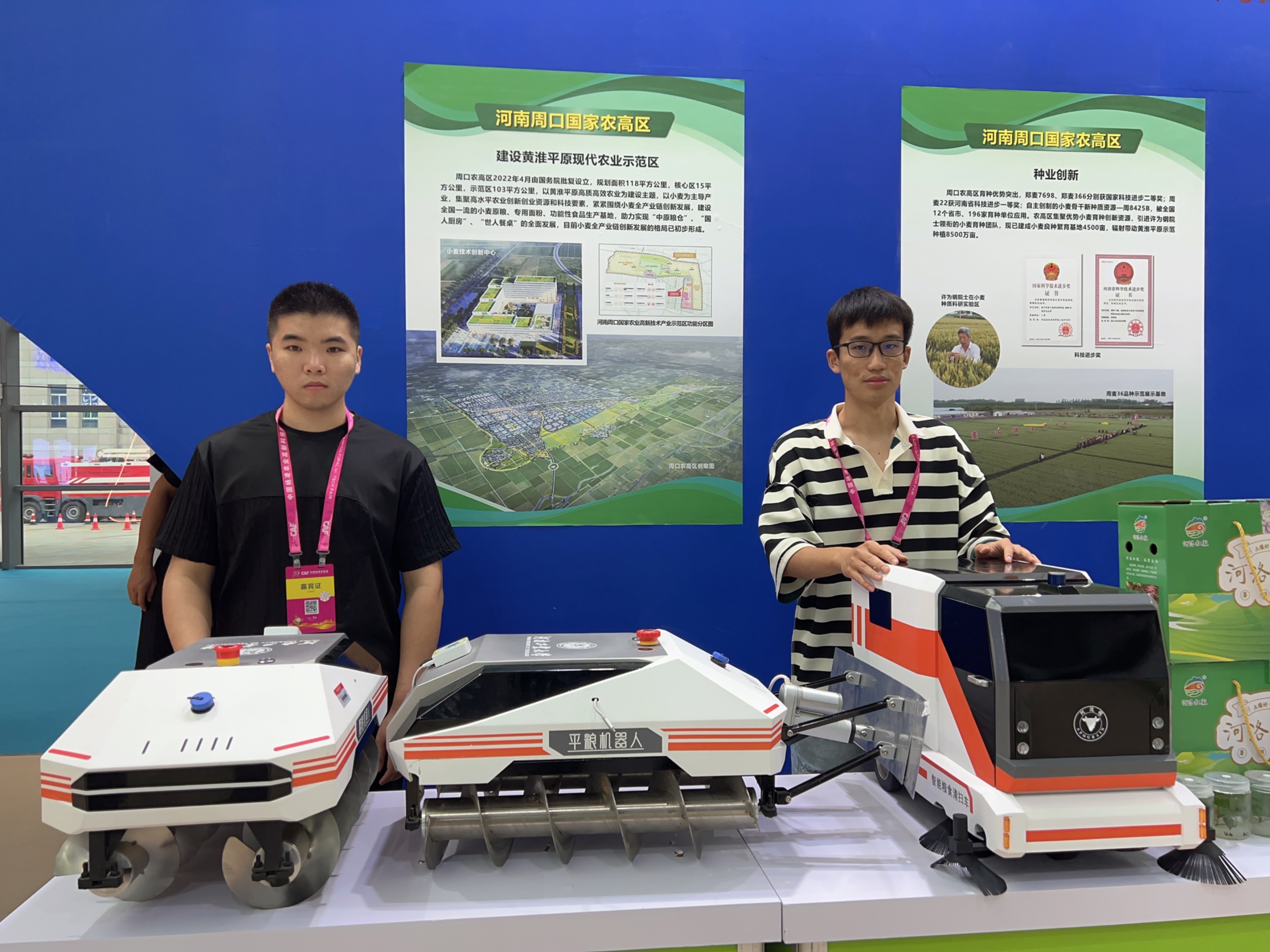“双一流”团队受邀参加农业高新技术成果展。粮油工程及设备系系主任王明旭、车辆工程系副主任孙朋带队展示了团队研发的平粮机器人、翻粮机器人、智能粮食清扫车、粮食加工在线粒度测试仪等科研成果。