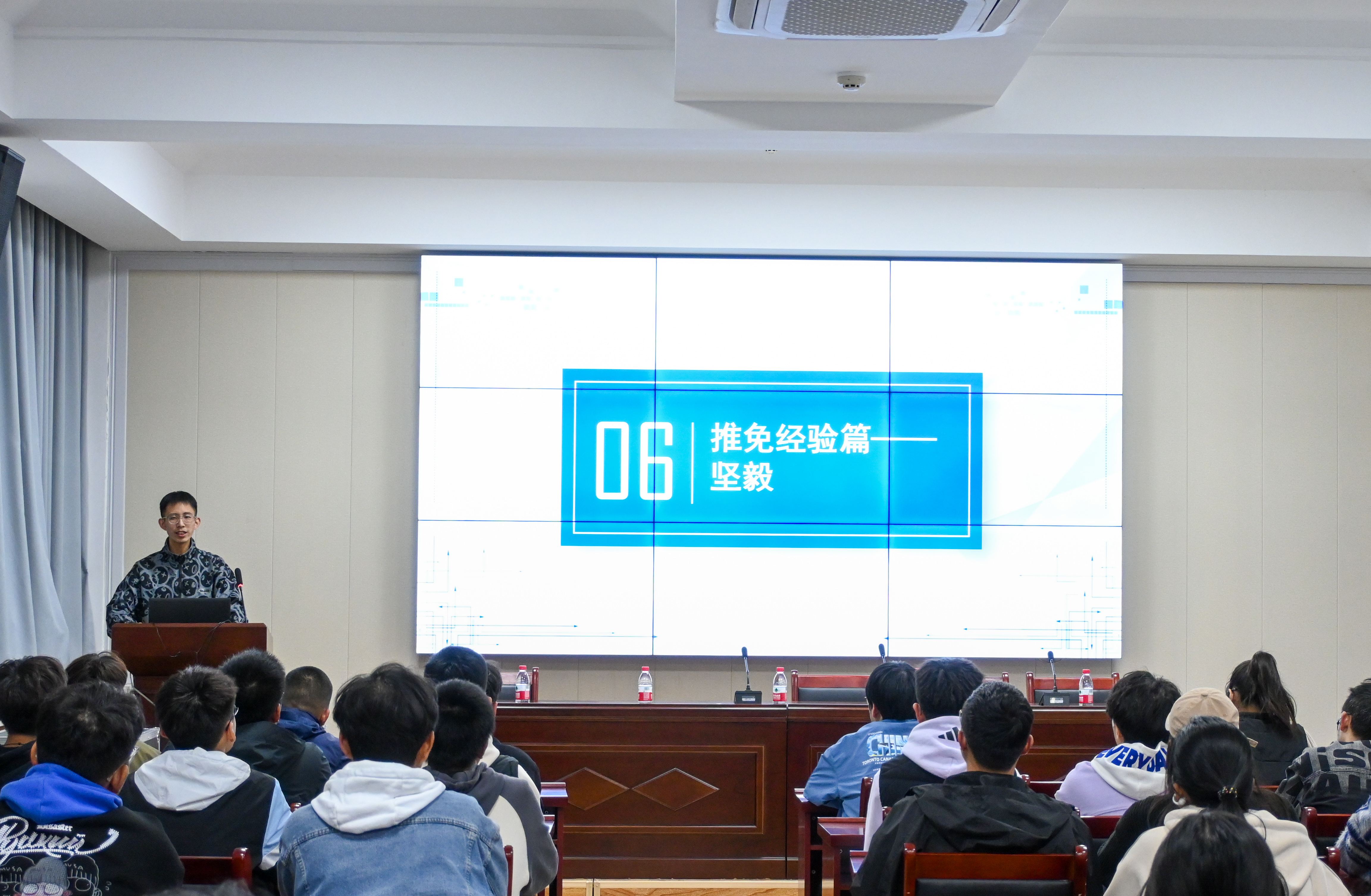 原茂森从自身经历出发,分享了专业课的学习方法及技巧,详细介绍了“挑战杯”、智能制造挑战赛等科技竞赛的经验感悟和成长收获,指出参加科技竞赛可以发掘创新潜能,提升团队合作能力和执行力,鼓励同学们勇于挑战,积极参赛。他还向大家详细分享了本人推免经验、申请推免条件以及推免过程中的注意事项,鼓励同学们要坚定信念,勇攀高峰,实现青春理想。