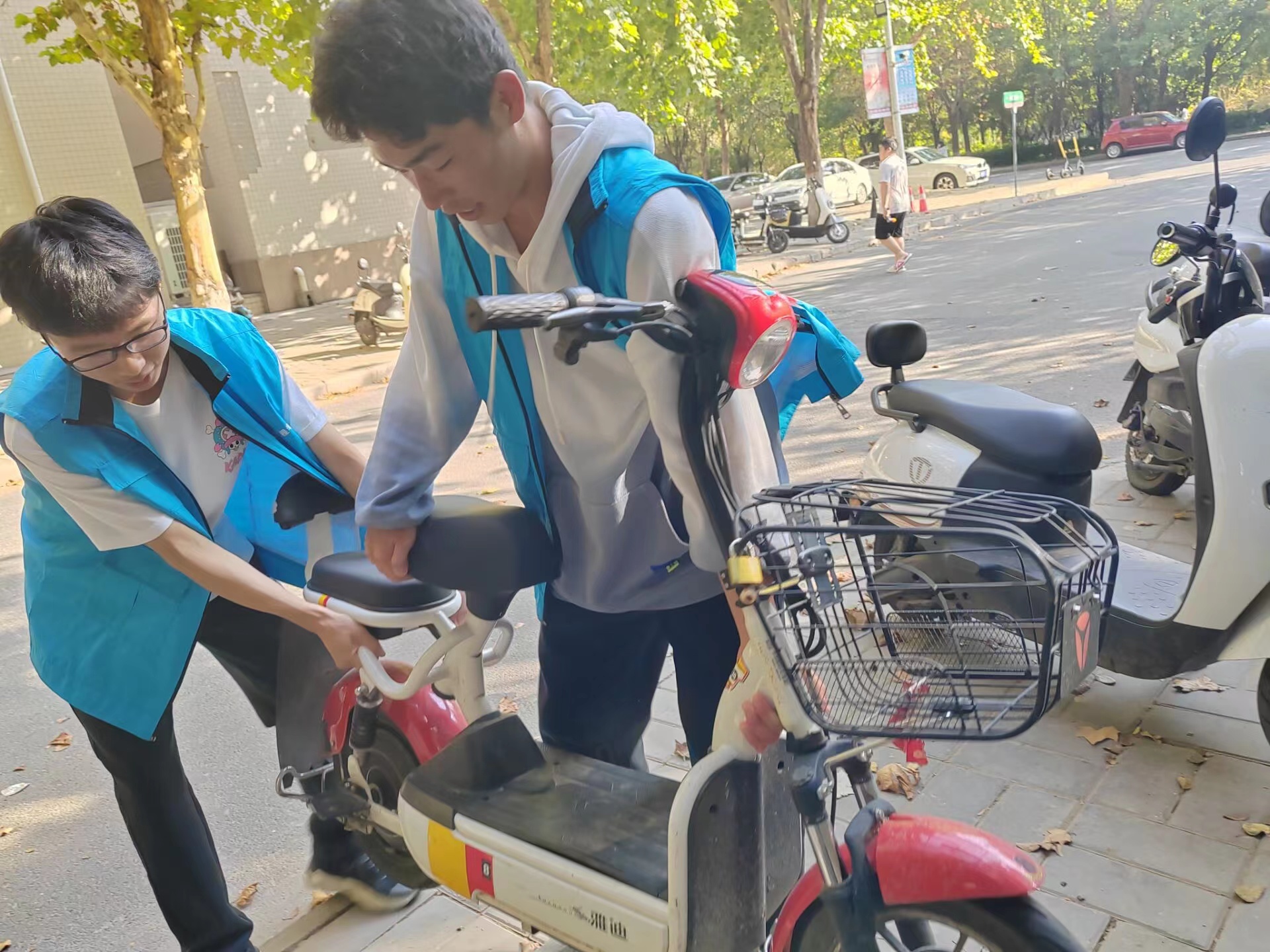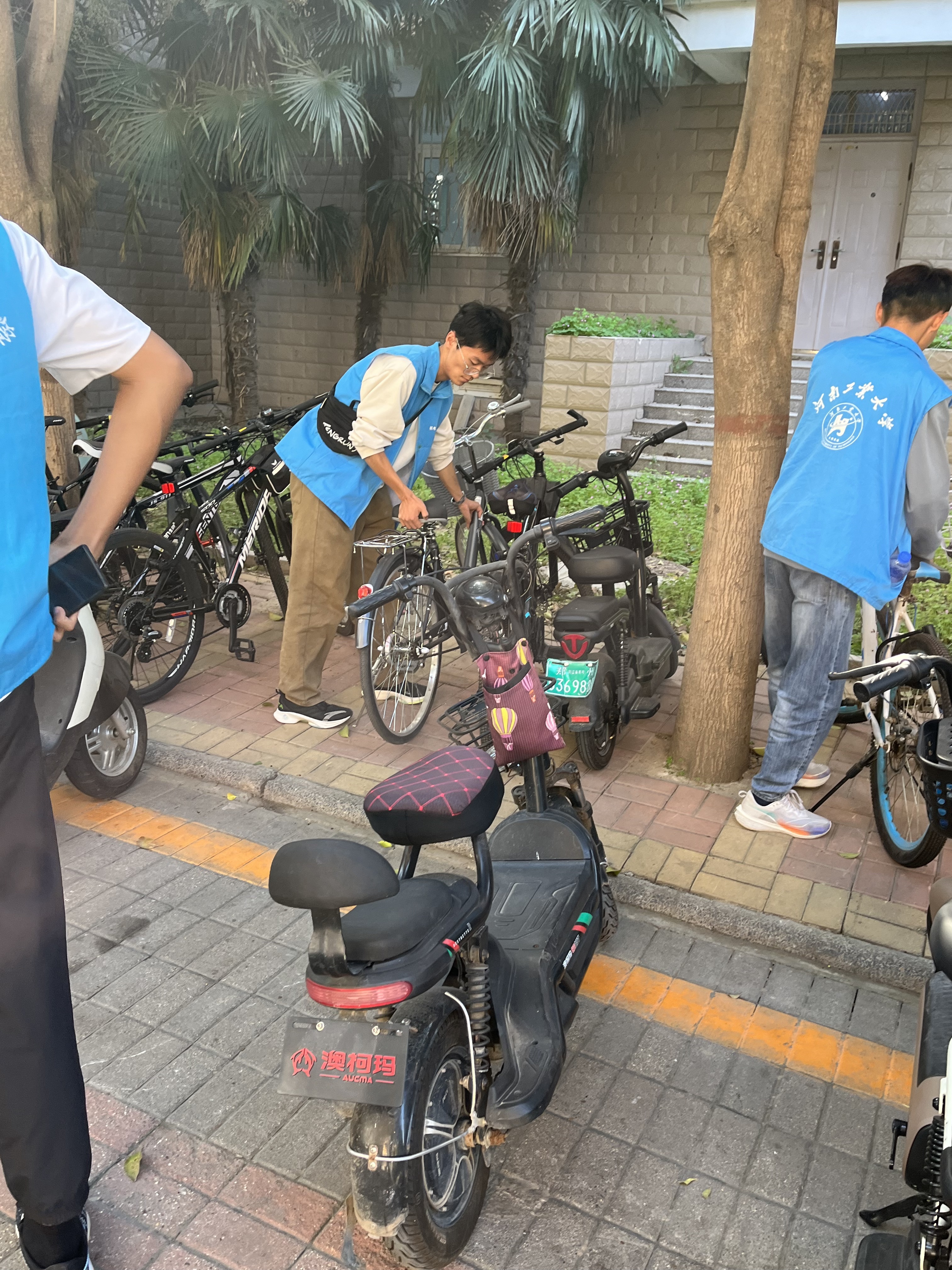 同学们来到各公寓区共享单车停放点,对乱停乱放的单车进行统一规范地摆放与整理。志愿者们以饱满的热情忙碌在单车摆放的志愿服务工作中,并对驻足停放单车的同学讲解了单车文明摆放的正确方式。
